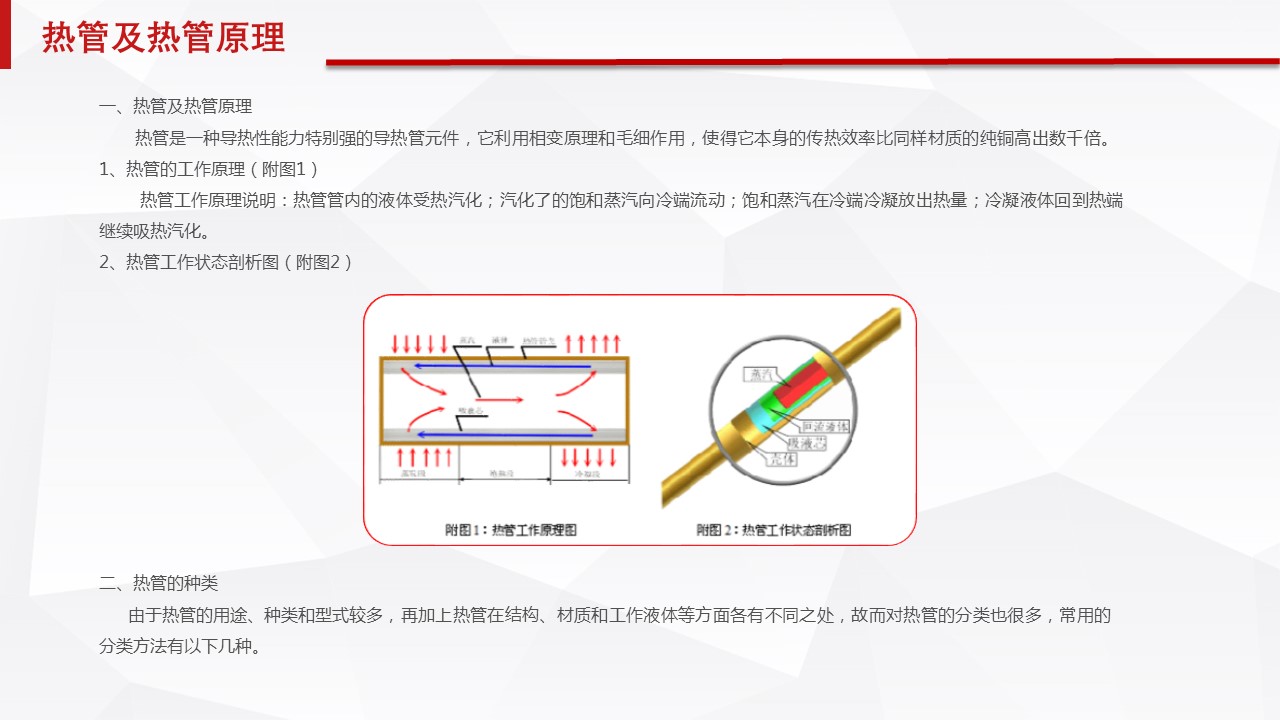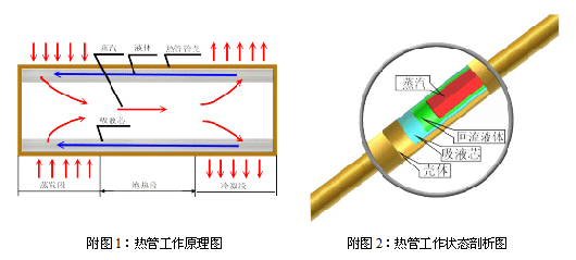 熱管工作原理說明:熱管管內(nèi)的液體受熱汽化;汽化了的飽和蒸汽向冷端流動(dòng);飽和蒸汽在冷端冷凝放出熱量;冷凝液體回到熱端繼續(xù)吸熱汽化。